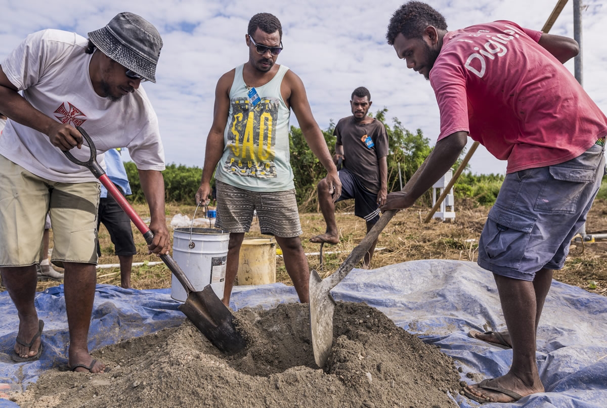 Project Coordinator Sam Tapo (centre) prepares the concrete – mixed 'island style' on a tarpaulin. The concrete foundations for the weather station will help the instruments hold up to extreme winds that are likley in future cyclones.