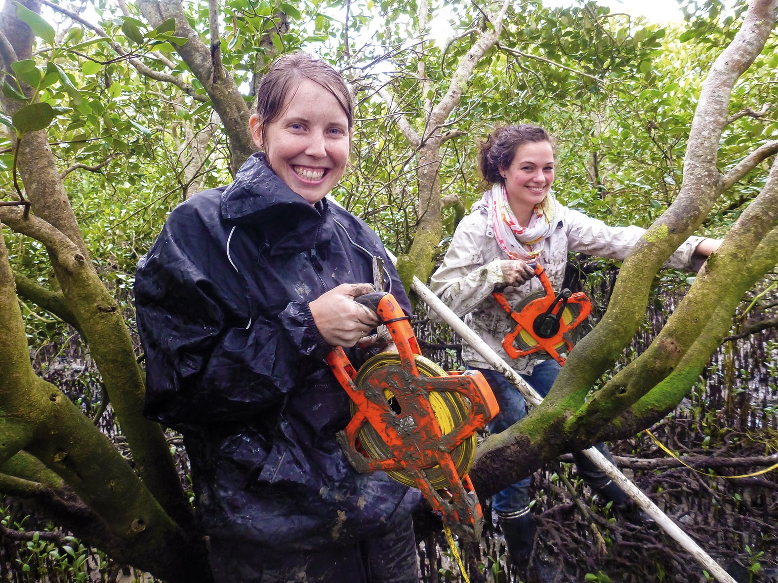Betty Gubri (right) with another PhD student Rebecca Gladstone-Gallagher (left) conduct fieldwork amongst the mangroves in Pahurehure Inlet, Manukau Harbour.