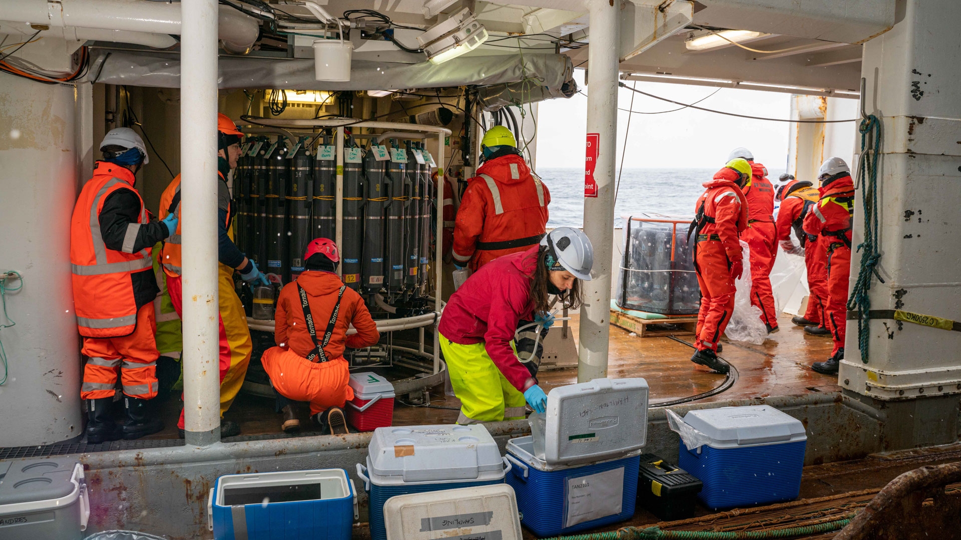 The daily routine on the Antarctic voyage begins with the morning CTD and trace metal rossette casts.