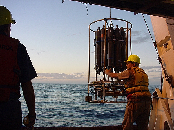 CTD (conductivity, temperature and depth) instrument being lowered into the ocean.
