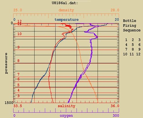 CTD profile for Valerie Seamount showing temperature, salinity, and dissolved oxygen profiles (Station 155).