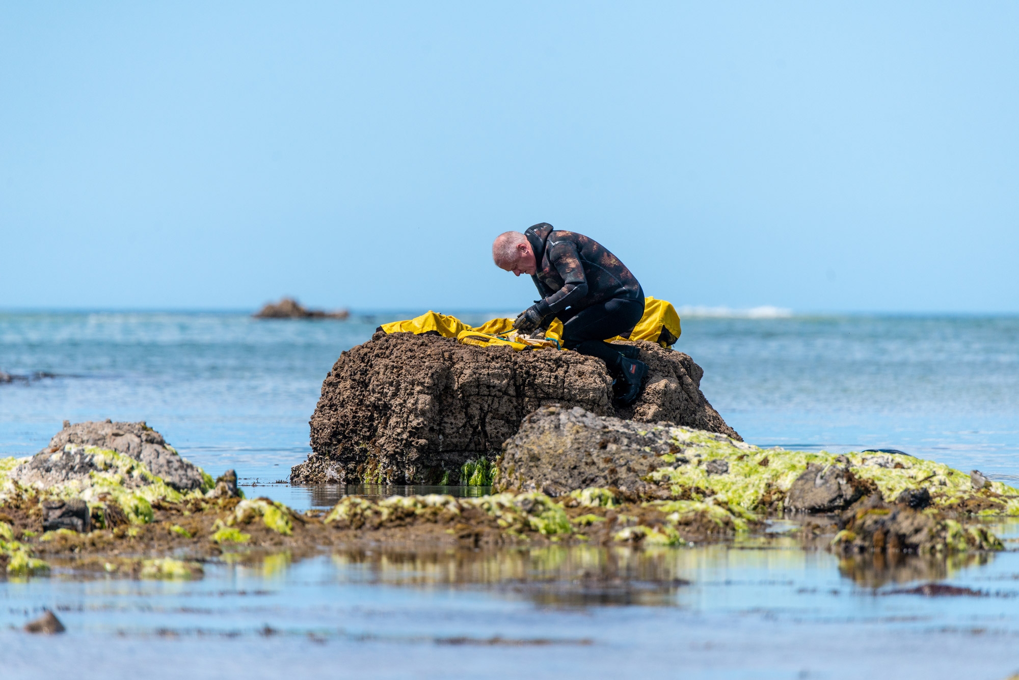 Dean Stotter counts the young lobster on a rock.