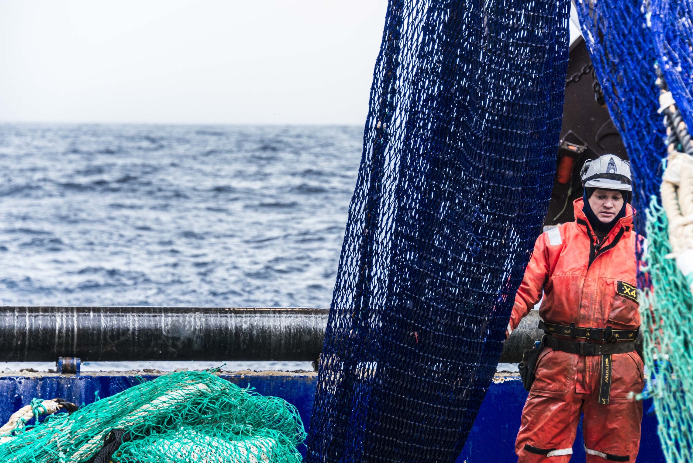 Deckhand Shane Harvey working on the trawl deck. Photograph by Dave Allen on 20 February 2015.