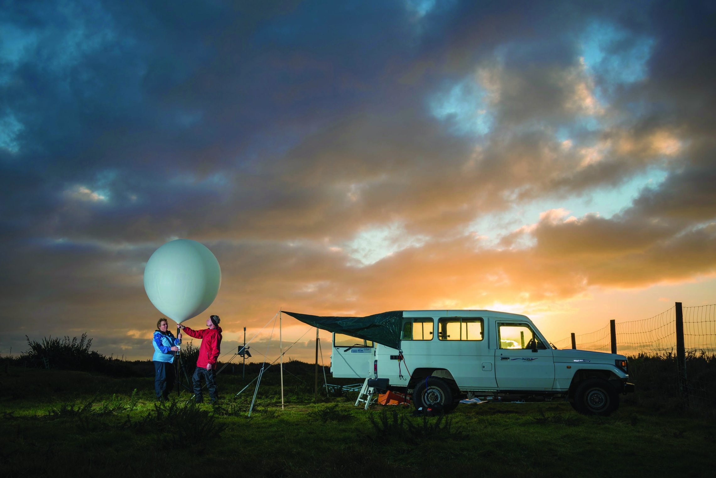 NIWA's Sally Gray (left) and Tony Bromley prepare to release a weather balloon.