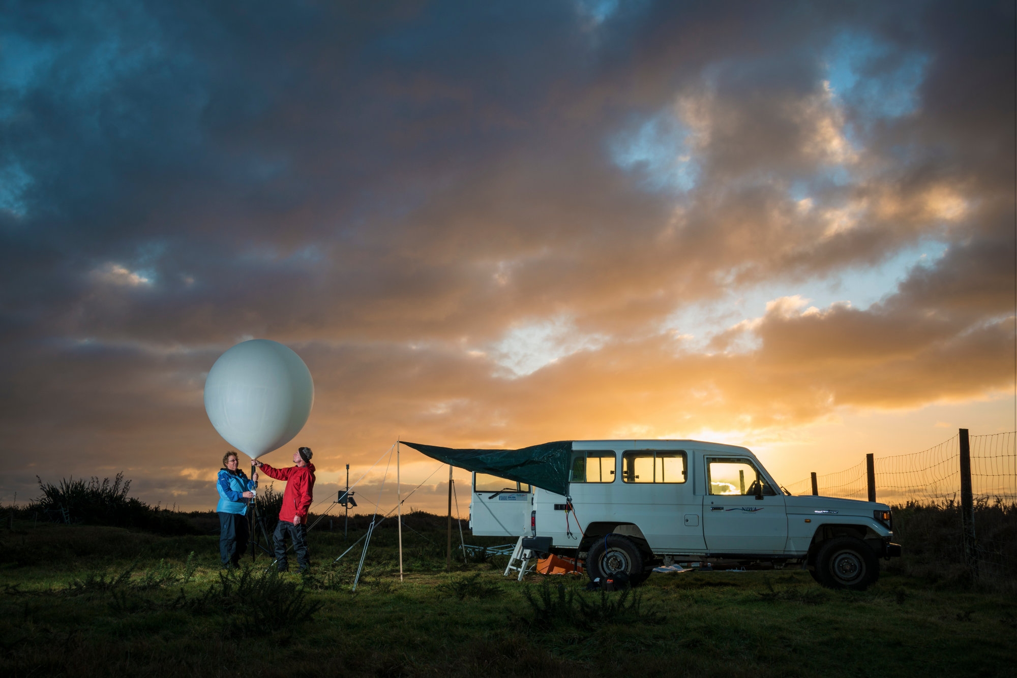 NIWA's Sally Gray (left) and Tony Bromley prepare to release a weather balloon, the attached Radiosonde transmits a range of atmospheric data back to their receiver in Haast. The balloon will reach an altitude greater than 30km and coincide with overnight DEEPWAVE research flights from Christchurch. Photography by Dave Allen on 22 June 2014.