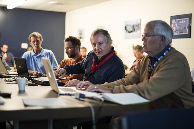 NIWA Meteorologist Richard Turner (mid) with DEEPWAVE Operations Director Jim Moore (right) during a weather briefing.