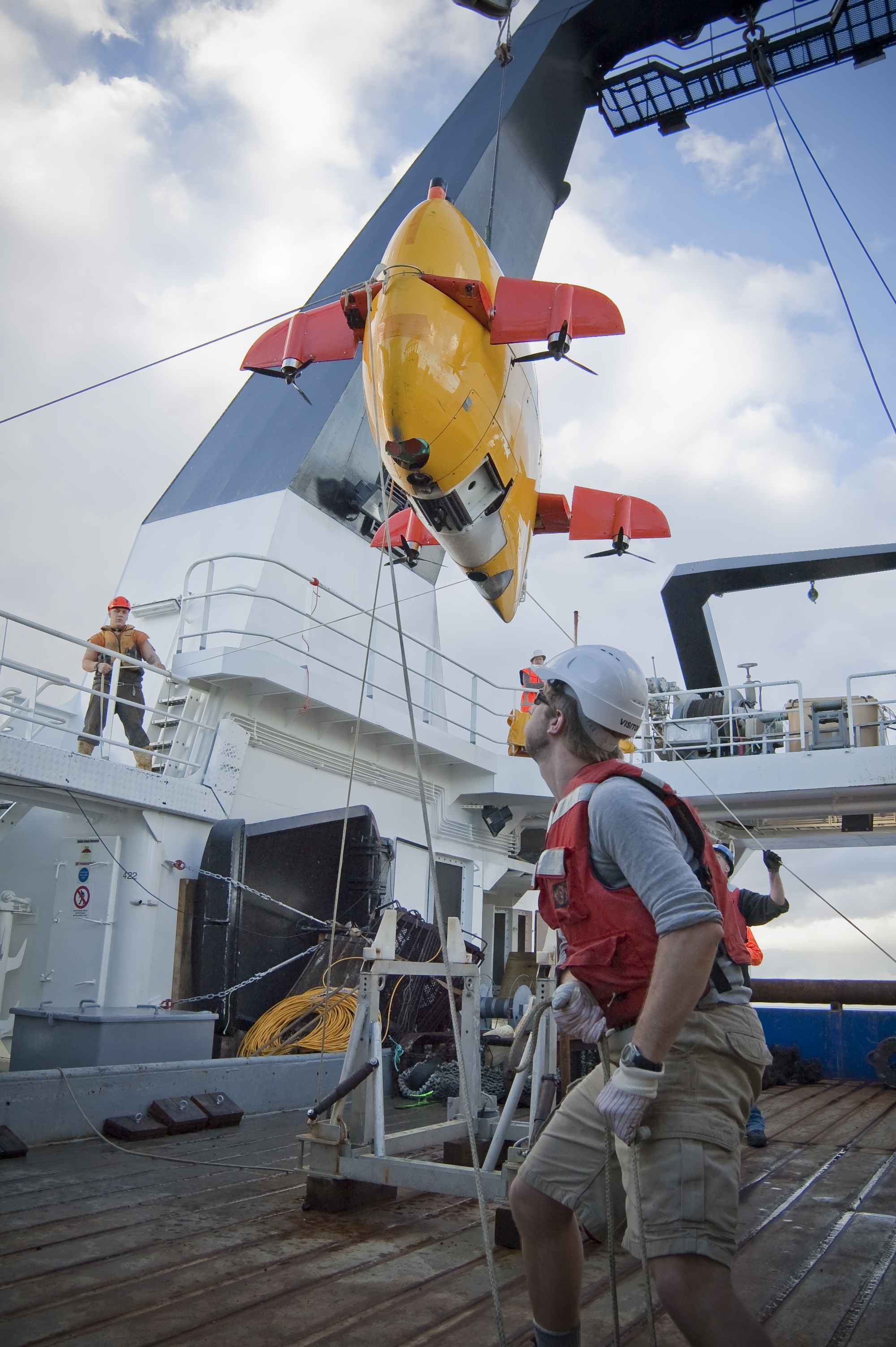 Deploying the Woods Hole Oceanographic Institution 'Sentry' from the RV Tangaroa. Credit: Kareen Schnabel/NIWA