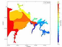 Detailed view of Mike 3Dfm hydrodynamic and sediment transport model grid and bathymetry for the Pahurehure Inlet and inner Manukau harbour.