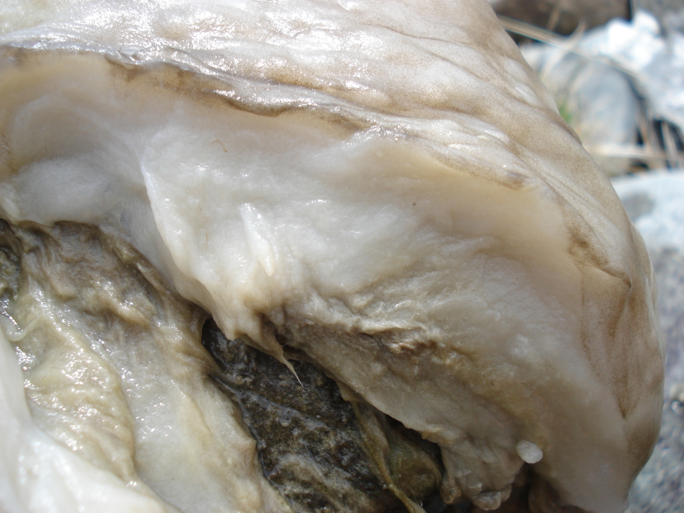 Didymo mat, cut open to show the polysaccharide stalks making up the bulk of the mat, with cells at the surface.