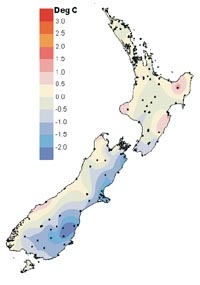 Difference from the averag air temperature in degrees Celsius for April 2003. (Click to enlarge)
