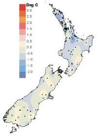 Difference from the averag air temperature in degrees Celsius for January 2003. (Click to enlarge)