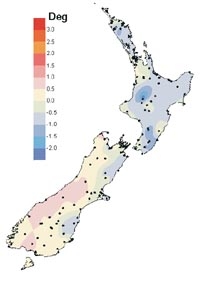 Difference from the average air temperature in degrees Celsius for April 2002. (Click to enlarge)
