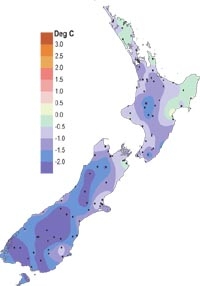 Difference from the average air temperature in degrees Celsius for February 2004. (Click to enlarge)