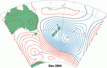 Difference from mean sea level pressure (hectopascals) in December – the month was dominated by some of the strongest westerly and southwesterly wind flows on record. Map: Jim Renwick