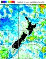 Difference from normal September surface temperatures in the seas around New Zealand.