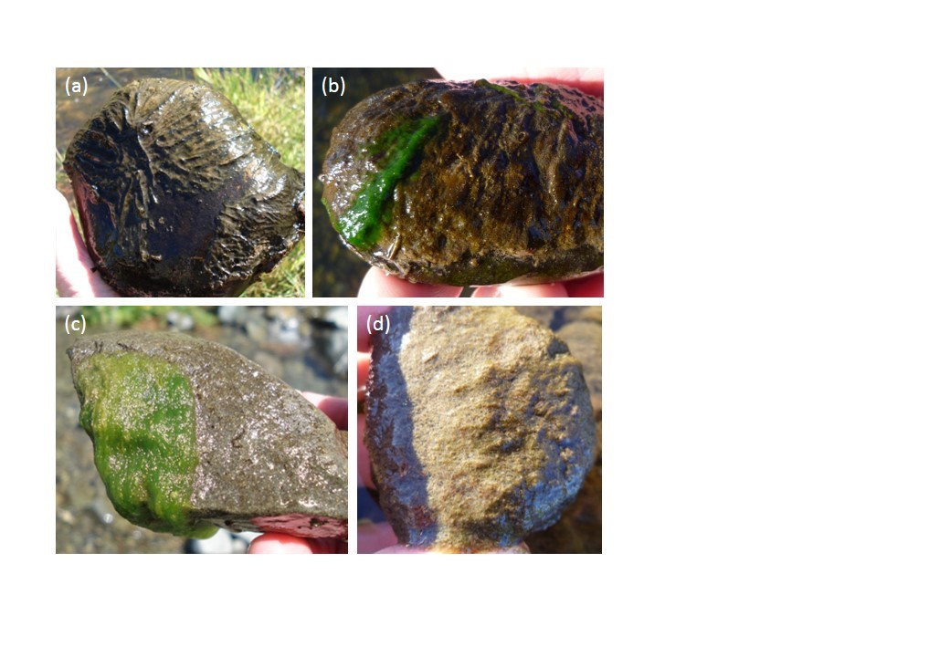 Figure 2. Different types of periphyton. (a) Cyanobacterial mat with some thin film; (b) green filaments and brown mat; (c) green filaments and rock with no visible algae; (d) loose “sludge”.