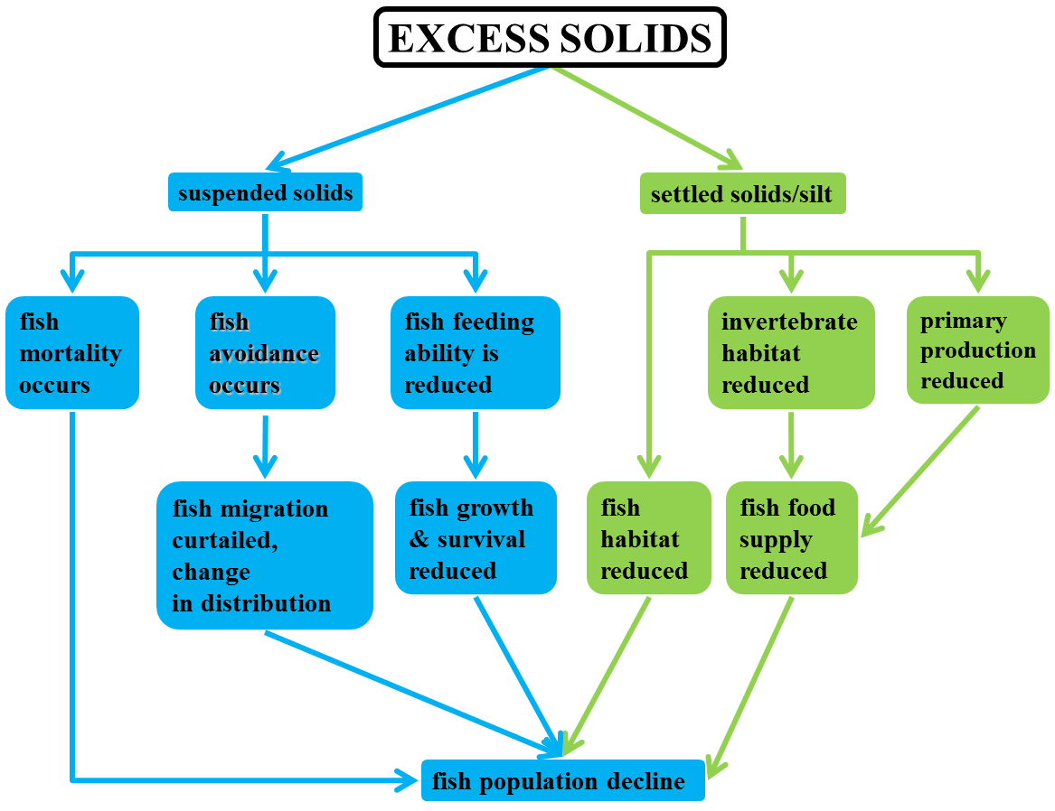Direct (blue) and indirect (green) effects of solids in river stream habitats.