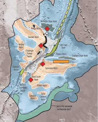 The New Zealand region, and distribution of hydrocarbon and mineral resources in the EEZ and ECS.