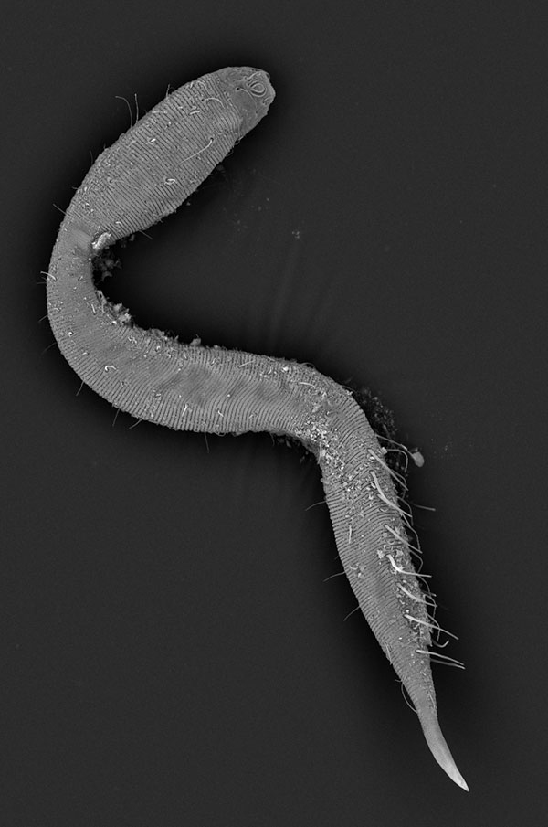 This new species of Dracograllus possesses modified hairs (ambulatory setae) on its head and near the tail which act as suckers. It uses them to walk around like a caterpillar!
