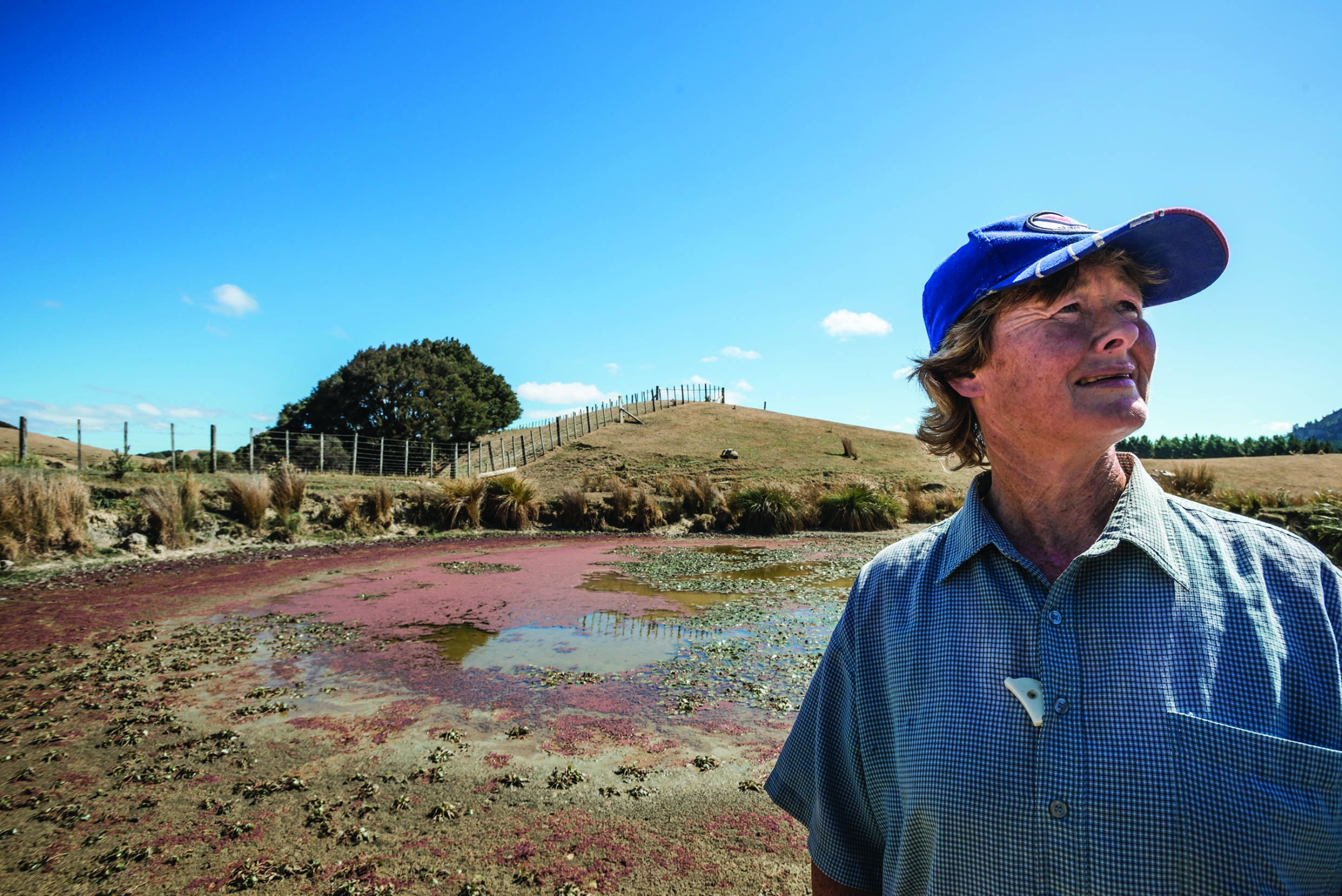 Farmer, Angela Hunt surveys a dry dam which is normally used to supply stock with drinking water, Wairarapa.