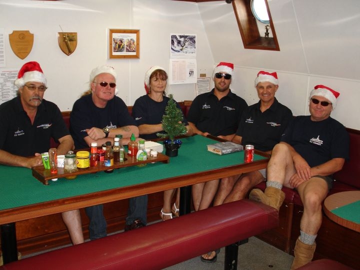 Christmas onboard RV Kaharoa, right to left: Peter Rodley, Paul Pascoe, Carol McCormack, Daniel Jones, Lindsay Copland, Mike Naidanovici.