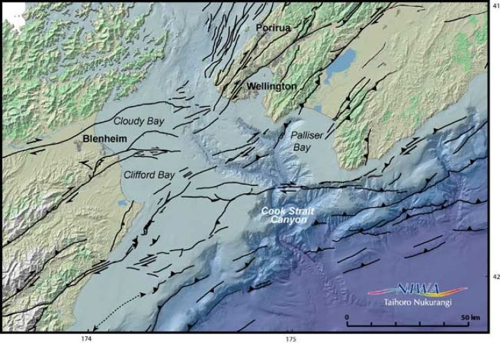 New map of active earthquake faults in central New Zealand, produced by NIWA. Onshore faults are from the GNS Science Active Faults database.