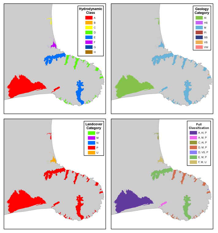 EEC mapped for Banks Peninsula showing hydrodynamic, geology and land cover classes and the full classification.