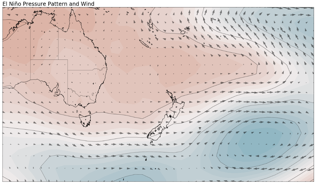 A composite, or average, of the summer pressure and wind pattern during 4 different El Niño events. Areas of above normal pressure are shaded in red while areas of below normal pressure are shaded in blue.