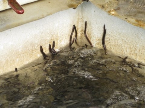 Elvers in the holding tank at the Karāpiro Dam on the Waikato River. A special permit from the Ministry of Primary Industries is required to capture, hold and transfer elvers to locations upstream of instream obstacles. Credit: NIWA