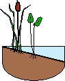 Emergent aquatic plants are rooted in the water-logged sediments while leaves and stems protrude up above the water’s surface.