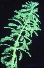 Emergent shoot of parrot’s feather (Myriophyllum aquaticum) showing minute flowers in the axils.