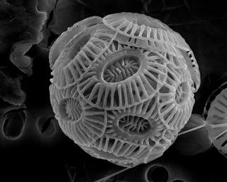 Emiliania huxleyii, at 18000x magnification [Hoe Chang].