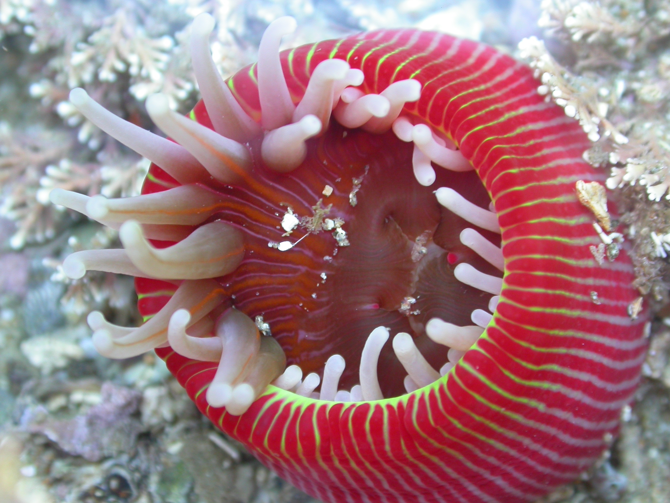 Epiactis thompsonii, an anemone commonly found in the rocky intertidal zone of the South Island coastline, photographed in Moeraki. This species is viviparous: the young develop inside the parent before they are released into the ocean. Credit: Kimberley Seaward