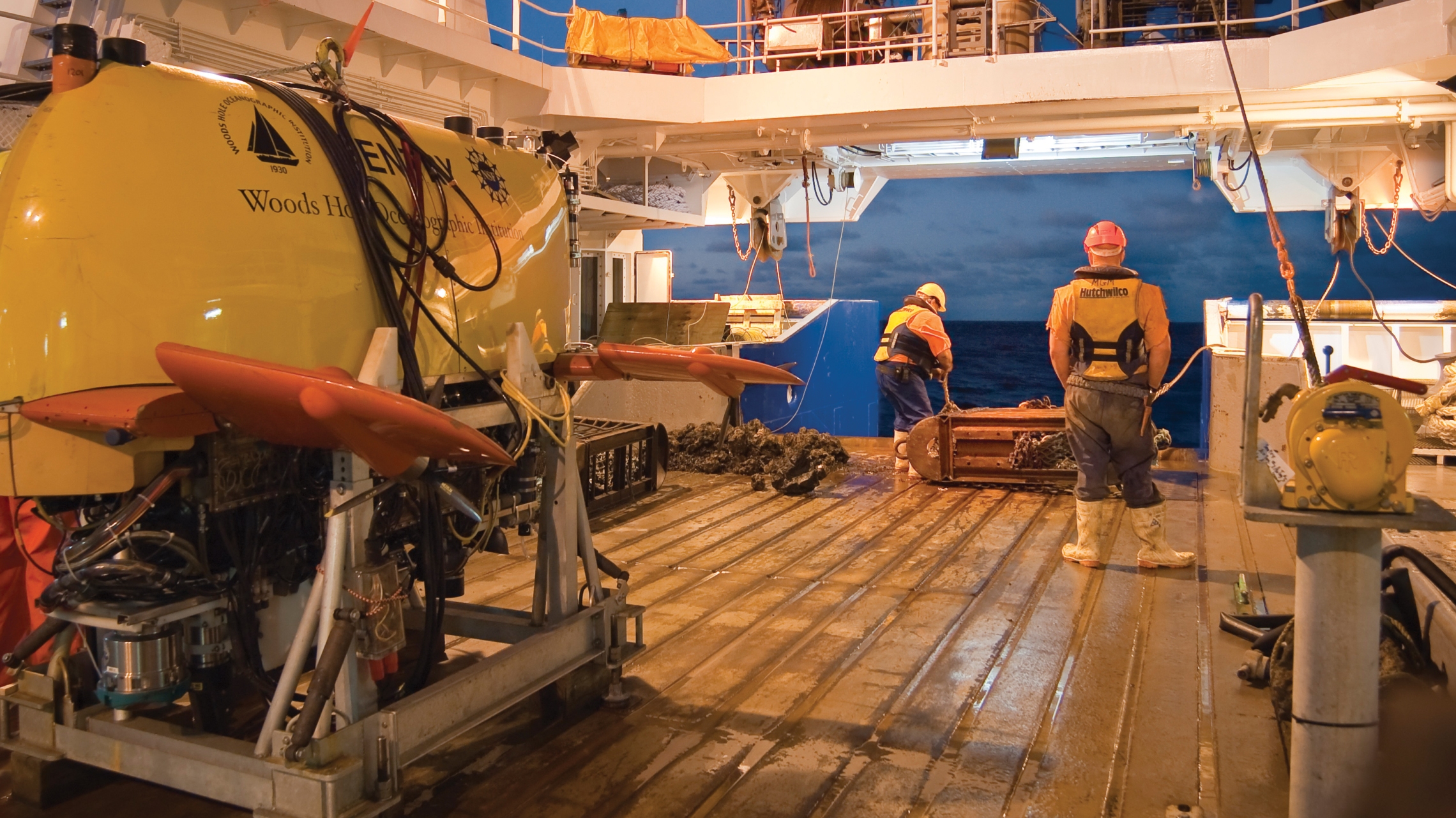 An epibenthic sled being deployed aboard the RV Tangaroa. Epibenthic sleds are towed across the rough ocean floor to take samples of large fauna and loose rocks. The object parked on the left hand side is The Woods Hole Oceanographic Institution 'Sentry'. Credit: NIWA/Kareen Schnabel.