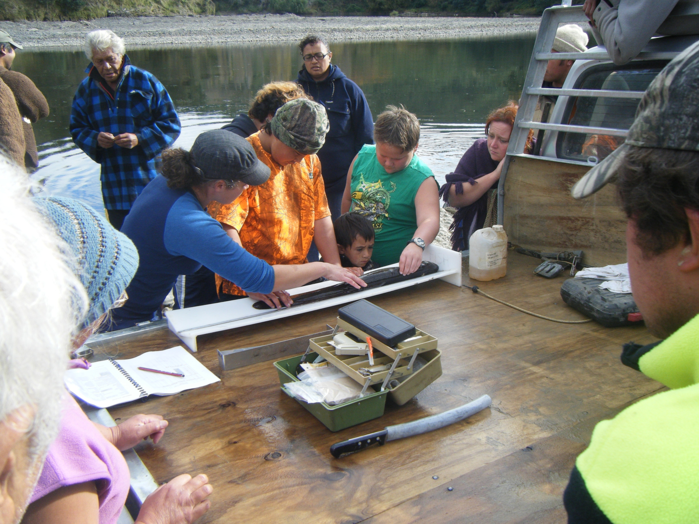 Erica Williams assisting tamariki measuring an eel from the Whanganui River during a tuna training workshop at Hiruharama. Credit: Cam Speedy.