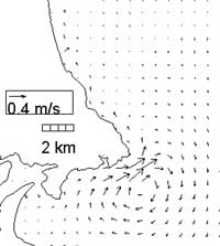 Numerically-predicted currents show a large eddy spinning up south of Cape Rodney on the incoming tide.