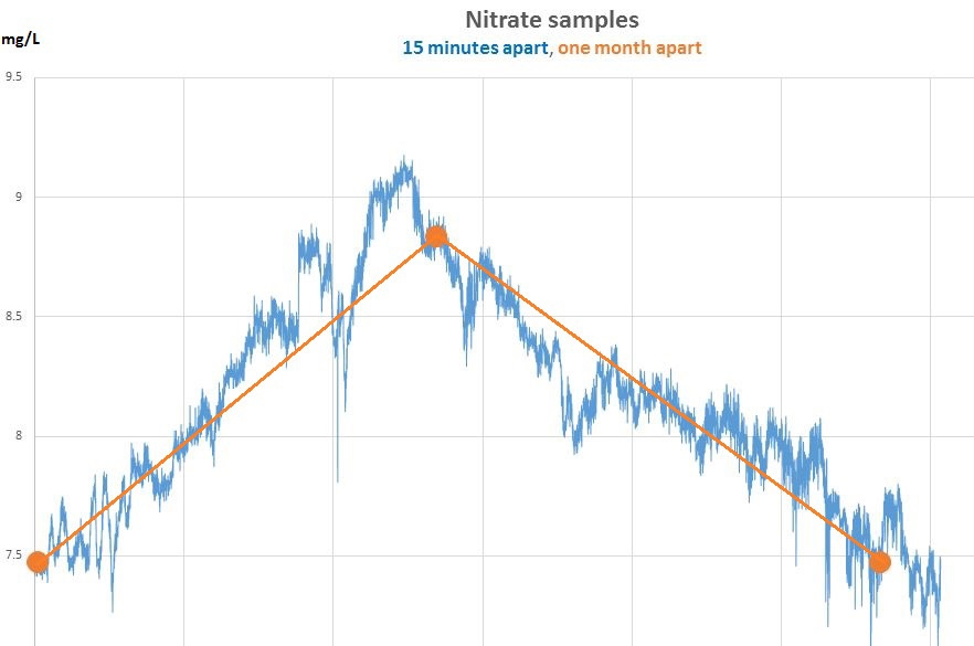 A real data example showing the ‘information’ lost by infrequent sampling. The monthly value (orange trace) under-represents the peak by 5% and provides little indication of how nitrate concentration varies cyclically or with flow dynamics.