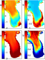Estimated concentrations of dissolved inorganic nitrogen (DIN) (top) and phytoflagellates (phytoplankton, bottom) in the Firth of Thames. (a) when filter-feeders absent, (b) ratio of filter-feeders present: filter-feeders absent. All except phytoflagellat
