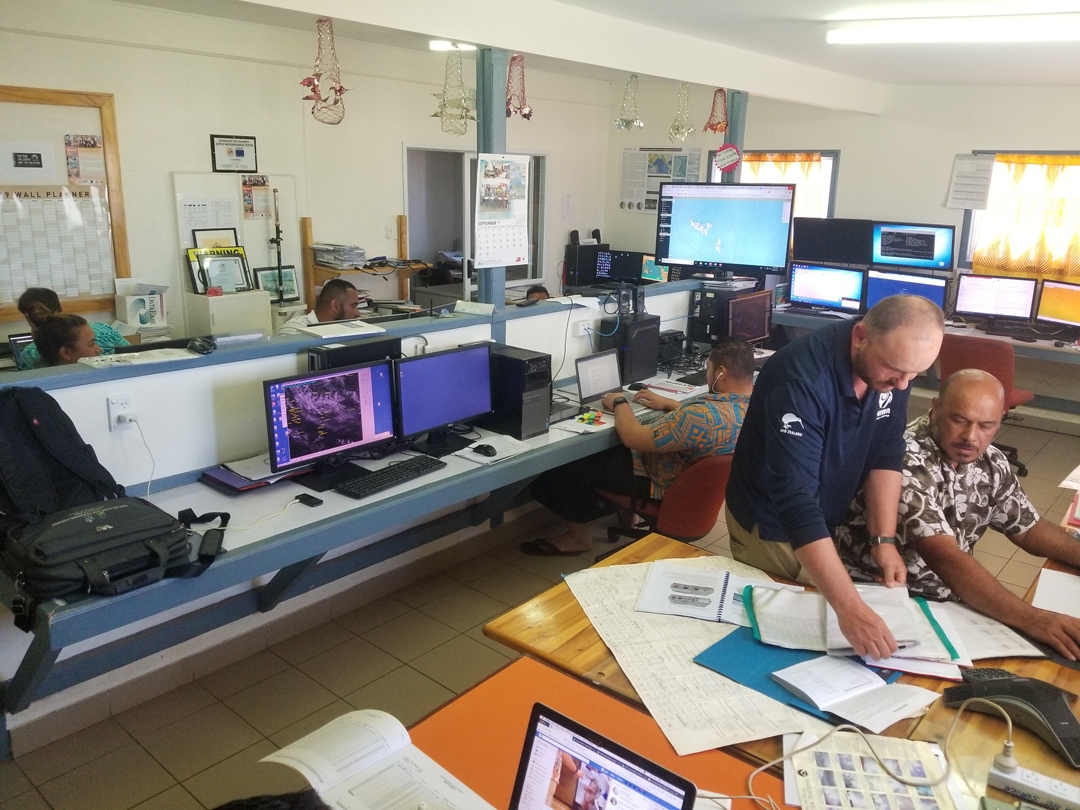 NIWA's Evgeny Fardman working with staff from the Tonga Meteorlogical Service. [Shaun Williams].