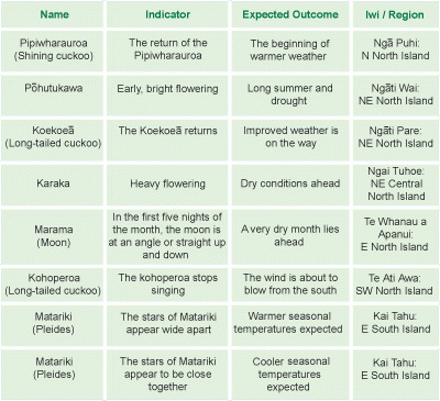 Examples of environmental indicators used by Maori to forecast changes in climate.