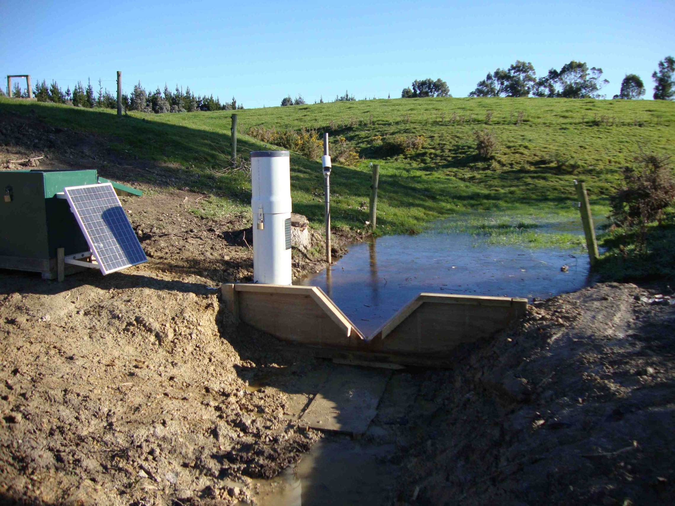 Foreground: surface runoff water flows from the gully through the v-notch weir. Background: a time-lapse camera visually records the level against a reference staff gauge plate. At far left: the green box with the solar panel contains a water sampler and power supply. Left: a stilling well houses flow telemetry instruments. Photo: Evan Baddock