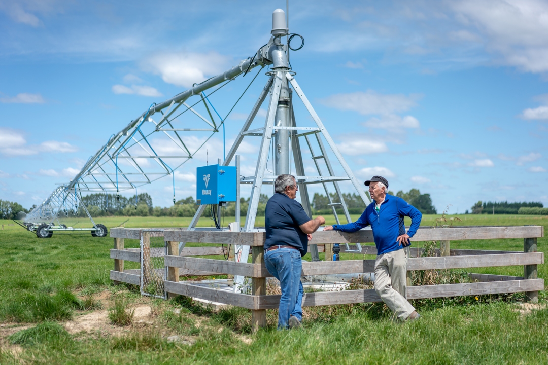 Farmer Bruce Baggott (right) talks with NIWA environmental monitoring scientist Graham Elley about the best use of water on his Canterbury dairy property.