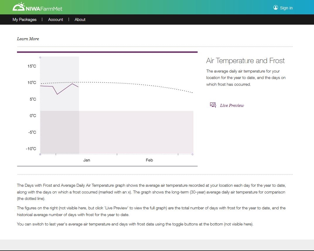 The Days with Frost and Average Daily Air Temperature graph shows the average air temperature recorded at your location each day for the year to date from www.niwa.co.nz/farmmet. [NIWA]