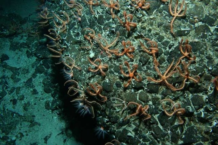 Dense aggregation of brittlestars on rock with arms feeding in water current.