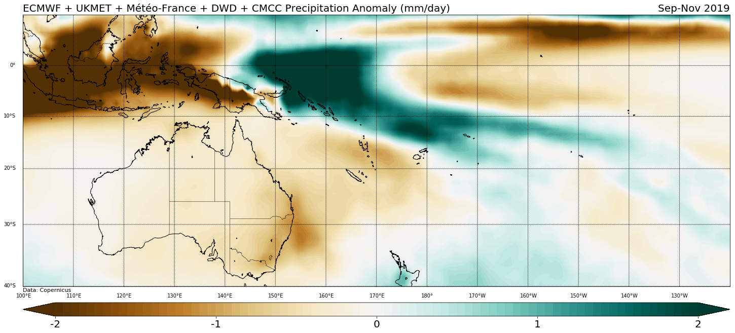 Figure 5. Multi-model ensemble forecast rainfall anomaly (mm/day), September-November 2019; green (brown) shades indicate above (below) normal forecast rainfall.