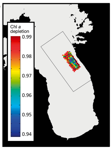 Figure 1: illustration of the estimated concentration of chlorophyll in the presence of the marine farm relative to that prior to the farming-area’s development. A value of 1 indicates no depletion. A value of 0.94 indicates 6% depletion. The inner-most black rectangle is the 1200 ha marine farming zone. The middle rectangle has an area that is 50% larger than the central one. The outer rectangle demarcates the maximum area to which the analysis initially assumed a farm influence may extend. Ultimately, the analysis revealed that the influence extended only to about central rectangle.