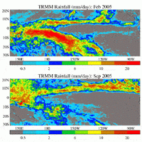 Figure 1: Average rainfall rate (mm/day) from TRMM 0.25 degree analysis for months of February (upper) and September (lower) 2005. Contours at uneven of 0.5, 1, 2, 4, 6, 8, 10, 15, and 20 mm/day.