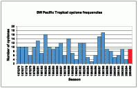 Figure 1. The number of Southwest Pacific tropical cyclones for the 2004/05 season (solid red bar) compared with frequencies during the past 30 years. The horizontal green line indicates the 30-year average.* Not including Ingrid which originated west of