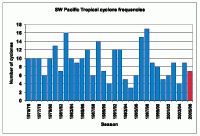 Figure 1: The number of Southwest Pacific tropical cyclones for the 2005-06 season (solid red bar) compared to frequencies during past 30 years. The horizontal green line indicates the 30-year average. Not including Kate, which remained west of 150 E.