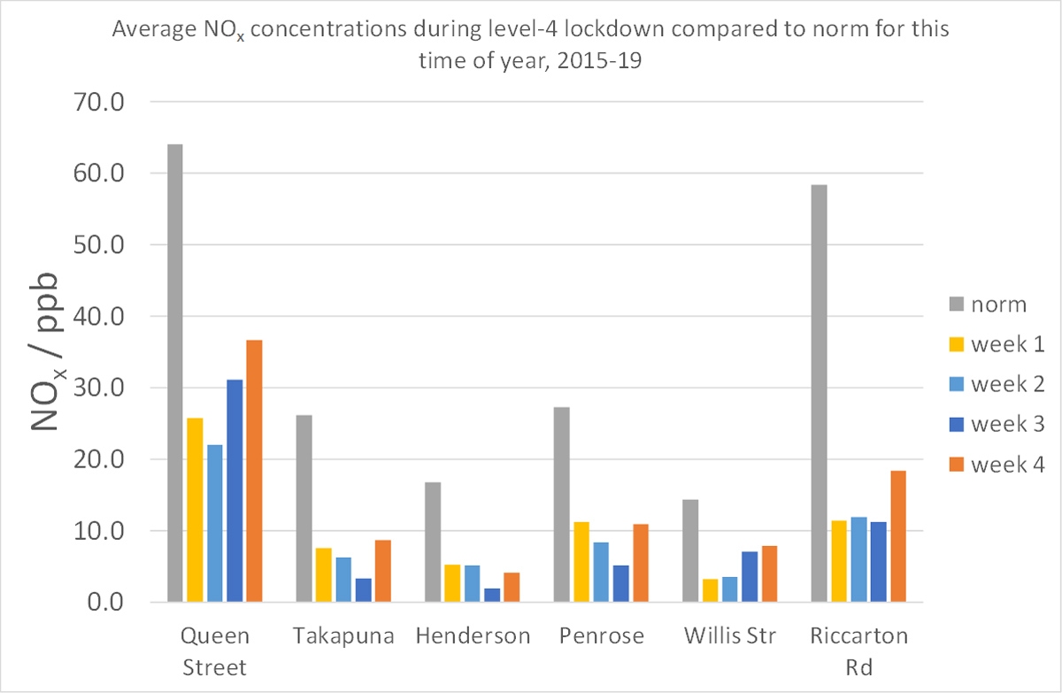 Figure 1: Week-average NOx concentrations compared to the norm for this time of year (based on 2015-2019). [NIWA]